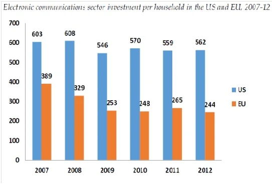 این تفاوت فاحش در میزان سرمایهگذاری در بخش مخابرات با وجودی است که تعداد جمعیت در 28 کشور عضو اتحادیه اروپا جمعاً 510 میلیون نفر و در ایالات متحد 323 میلیون نفر است.