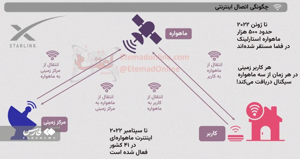 از میان پروژه‌های اینترنت ماهواره‌ای، استارلینک به‌عنوان یک فناوری منحصربه‌فرد با ۱۸۰۰ ماهواره مستقر در فضا دارای سرعت دانلود تا یک گیگابیت بر ثانیه و سرعت آپلود تا ۵۰۰ مگابیت در ثانیه است، همچنین با پهنای باند بالا هیچ محدودیت جغرافیایی نداشته و نسبت به سایر پروژه‌ها اختلالات کمتری دارد.