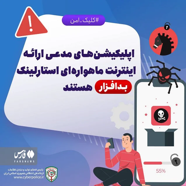 این گزارشگر اپلیکیشن‌های استارلینک را نیز جزو بدافزارها دانست و تاکید کرد: آنتن‌دهی این اینترنت ماهواره‌ای نیاز به تجهیزات سخت‌افزاری و برنامه‌های نرم‌افزاری دارد، به نحوی که برنامه‌ها و لینک‌هایی که اخیرا به‌عنوان دسترسی به استارلینک تبلیغ می‌شود همان بدافزارهای کلاهبرداری بوده و بدون دستگاه مربوطه هیچ اتصالی برقرار نخواهد شد.