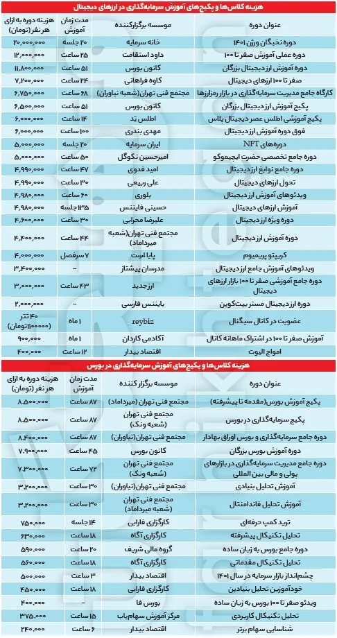 درکنار کلاسهای آموزشی، هزینههای پکیجهای آموزش هم بسیار قابلتامل است، برای مثال در حوزه ارزهای دیجیتال موسسه اطلستد ویدئوی آموزشی 14ساعته را 6میلیون تومان میفروشد و این یعنی هر ساعت فیلم آموزشی این موسسه برای خریدار 428 هزار تومان آب میخورد. کانون بورس یک پکیج آموزشی 51ساعته را 5/6 میلیون تومان، موسسه بلوری فیلم 60 ساعته را حدود پنج میلیون تومان، مدرسان پیشتاز یک پکیج آموزشی بدون درج ساعت آموزش، حدود 4/3 میلیون تومان به فروش گذاشته است.