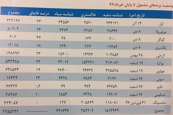 برمبنای آمار ارائه شده تا پایان خرداد ۹۷ از میان حدود ۲ میلیون و ۲۲۵ هزار گوشی رجیسترشده، بیشترین آمار به برندهای هواوی، نوکیا، اپل و سامسونگ تعلق داشته و بیشترین تعداد گوشی های قاچاق یا گوشی هایی که بعد از مدت یک ماهه مقرر، نسبت به رجیستری اقدام نکردند به ۳ برند اپل، نوکیا و هواوی تعلق دارد.
