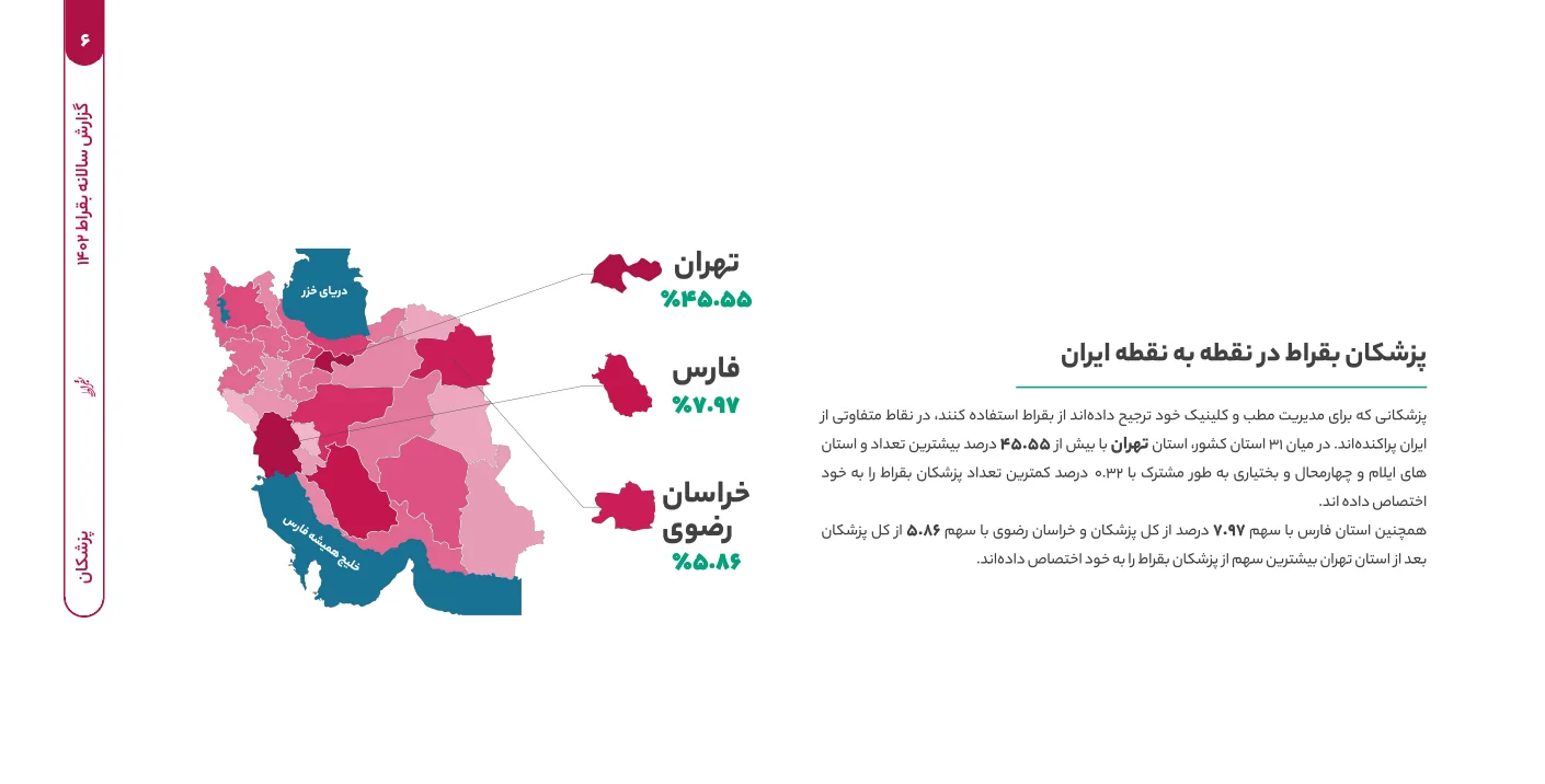 این گزارش امکان رصد رشد و توسعه سلامت دیجیتال را نیز فراهم کرده است. سهم 45.55 درصدی پزشکان تهران در بررسی نقطه به نقطه استفاده از مدیریت مطب و کلینیک نیز یک بار دیگر تاکیدی بر تراکم پزشکان در پایتخت است. این شاخص یک بار دیگر نگرانی درباره مرکزگرایی را تشدید میکند.