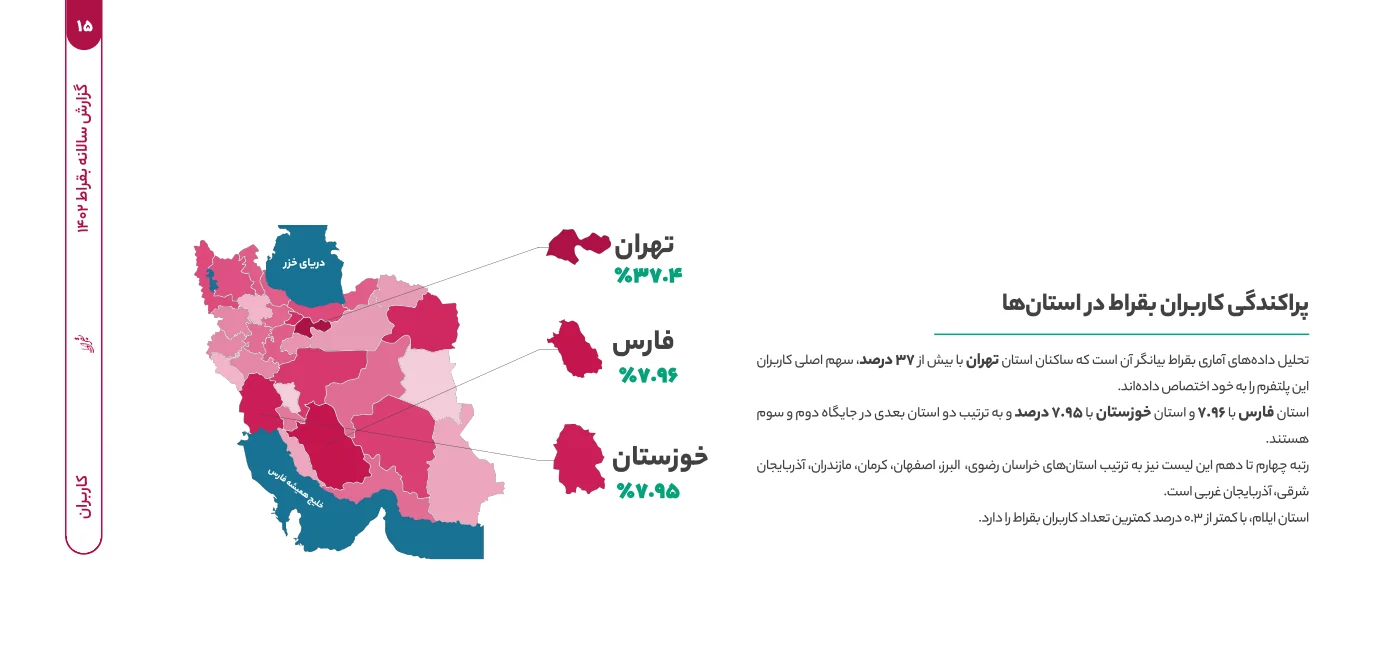 بر اساس گزارش سال 1402 پلتفرم آنلاین سلامت بقراط بیشترین تراکم پزشکان و همچنین بیشترین تراکم کاربران در تهران است. این موضوع از زوایای متفاوتی قابل توجه است. از طرفی بر اساس این گزارش علاقه پایتختنشینان نسبت به استفاده از خدمات سلامت دیجیتال بیشتر است و از سویی دیگر عواملی مانند ترافیک شهری، سرعت بالا و شلوغی زندگی روزمره و همچنین دسترسی بیشتر به ابزار و زیرساخت مناسب منجر به این استقبال شده است.
