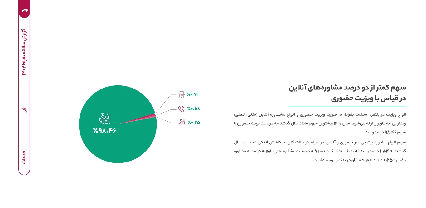 در بخشی از این گزارش که سهم استفاده از ویزیت آنلاین، تلفن، متنی و حضوری را مورد بررسی قرار داده، 98.46 درصد از سهم انواع ویزیت به ویزیت حضوری رسیده است. بر اساس این اطلاعات اعتماد به جریان سلامت دیجیتال، مخصوصا در حوزه ویزیت غیر حضوری نیازمند فرهنگسازی است.