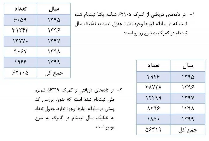 همچنین از بین ۷۱ هزار داده گمرک و ۱۰۶  هزار داده سامانه انبارها  فقط ۷۸۳۱ شناسه یکتا در هردو جدول وجود دارد که برابر داده های سامانه جامع انبارها ۵۴۷۰ انبار فعال و ۲۳۶۱ انبار غیر فعال  است.